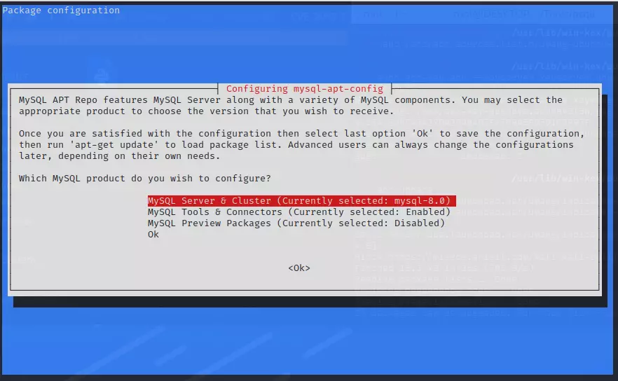sudo apt install ./mysql-apt-config_0.8.22-1_all.deb Jalankan perintah satu persatu diatas ini. Selanjutnya setelah menjalankan perintah yang terakhir, akan muncul pop up pada terminal kalian. Karena Kali Linux tidak didukung secara resmi oleh MySQL itu sendiri, maka pilih rilis Debian Bullseye.